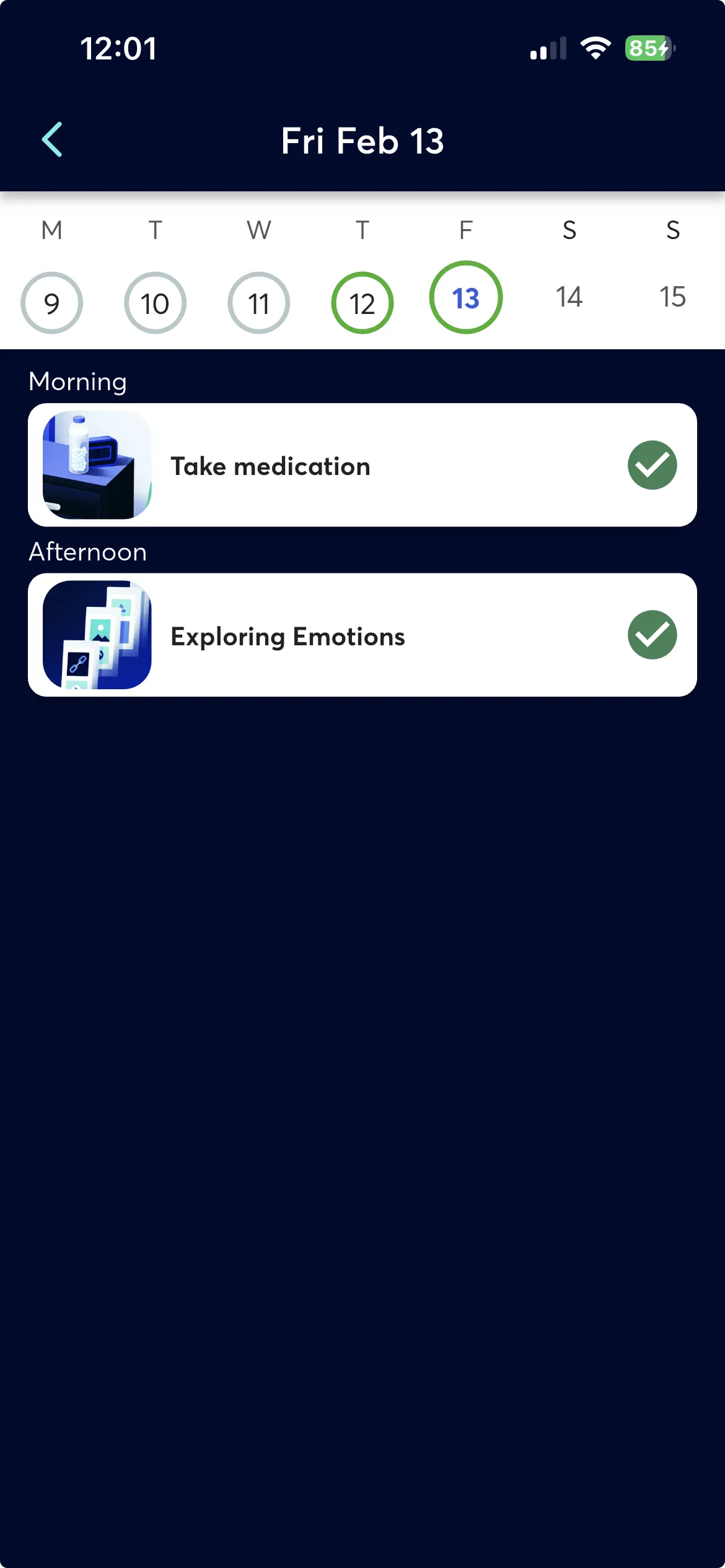 Cards are grouped by time of day, just like recurring cards on the Feed. Each row shows a thumbnail image, the card name, and a completion indicator.