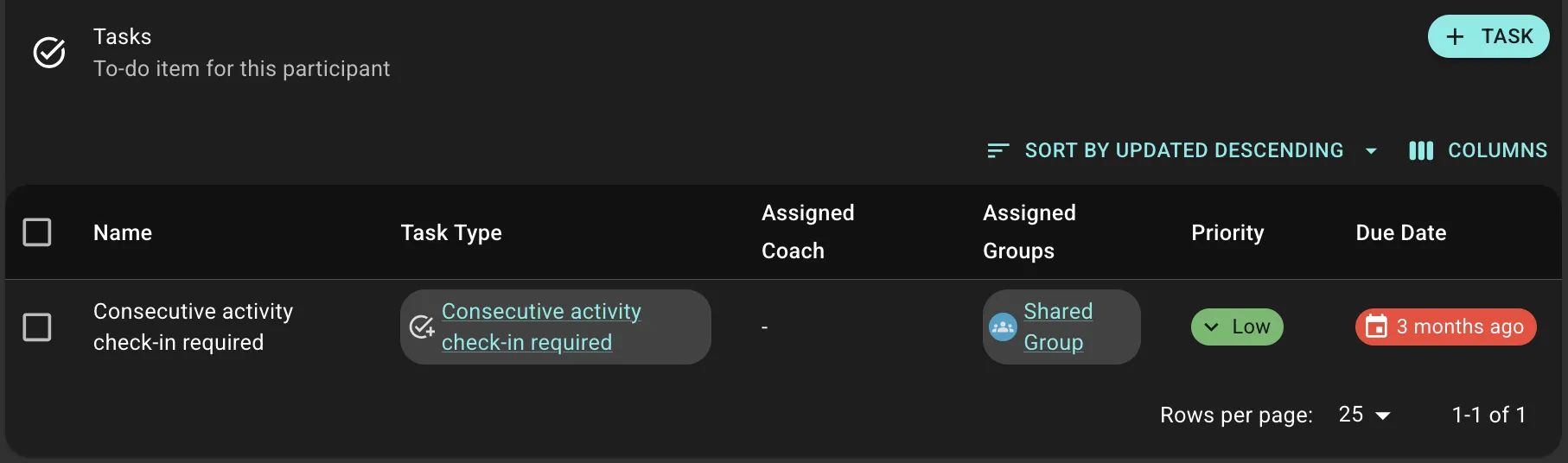 - Name, linked Participant (optional), Task Area, Priority (Low/Medium/High/CRITICAL), Due Date (optional), Assigned Coach/Groups